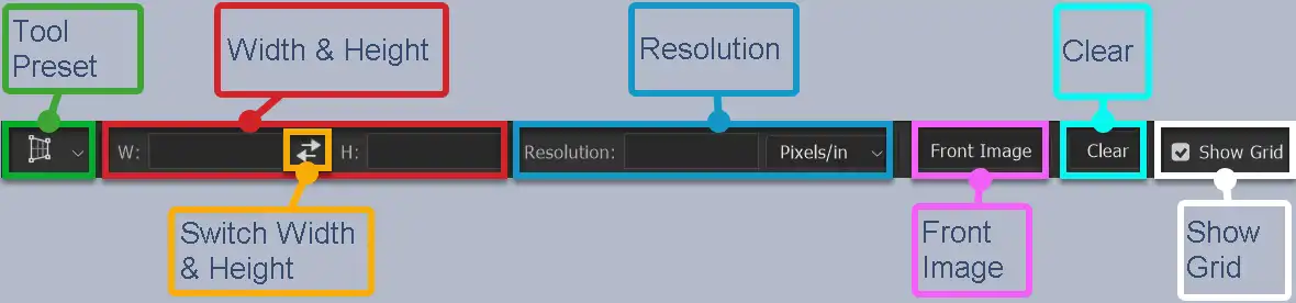 Select the image to copy the dimensions from, then click the Front Image button. The height, width and resolution are automatically entered into the relevant boxes, which you can use to crop another open image.