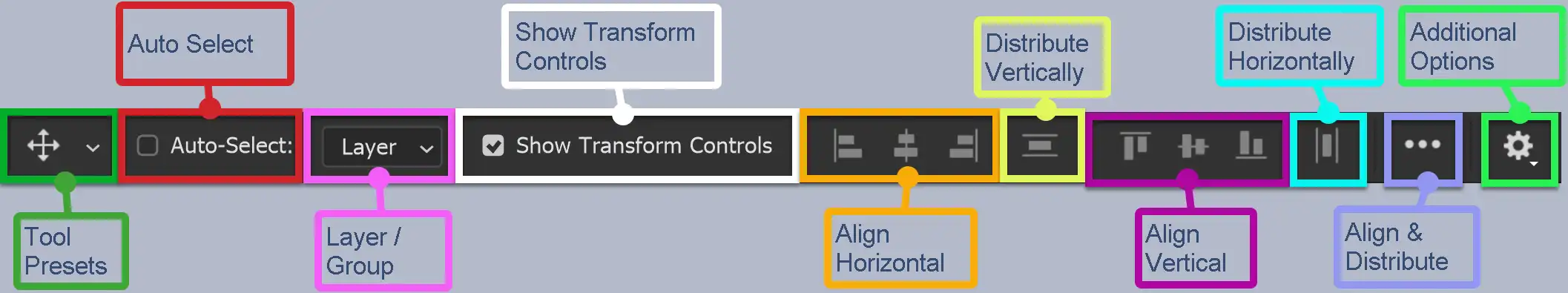 These buttons allow you to align and distribute (space evenly), multiple layers. Having said that, if you turn on and use smart guides, it’s often not necessary to use the Align or Distribute tools. Anyway, here’s how to do it.