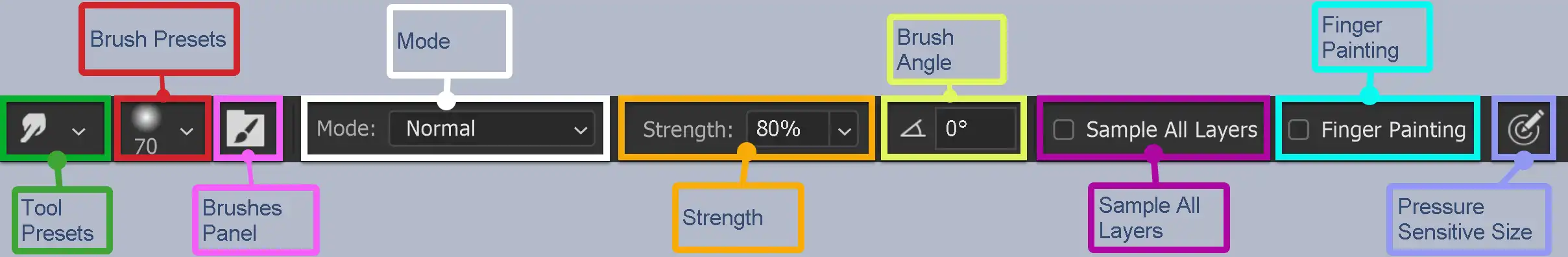If Finger Painting is not selected, the Smudge tool will use the color under the cursor at the beginning of each stroke.