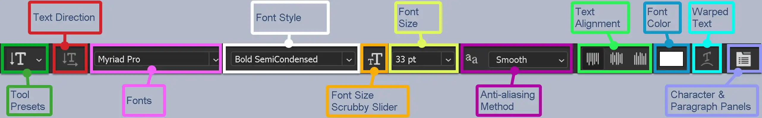 This tool works the same as the Horizontal Type Tool, which users should be more familiar with. Please see that guide for more details.