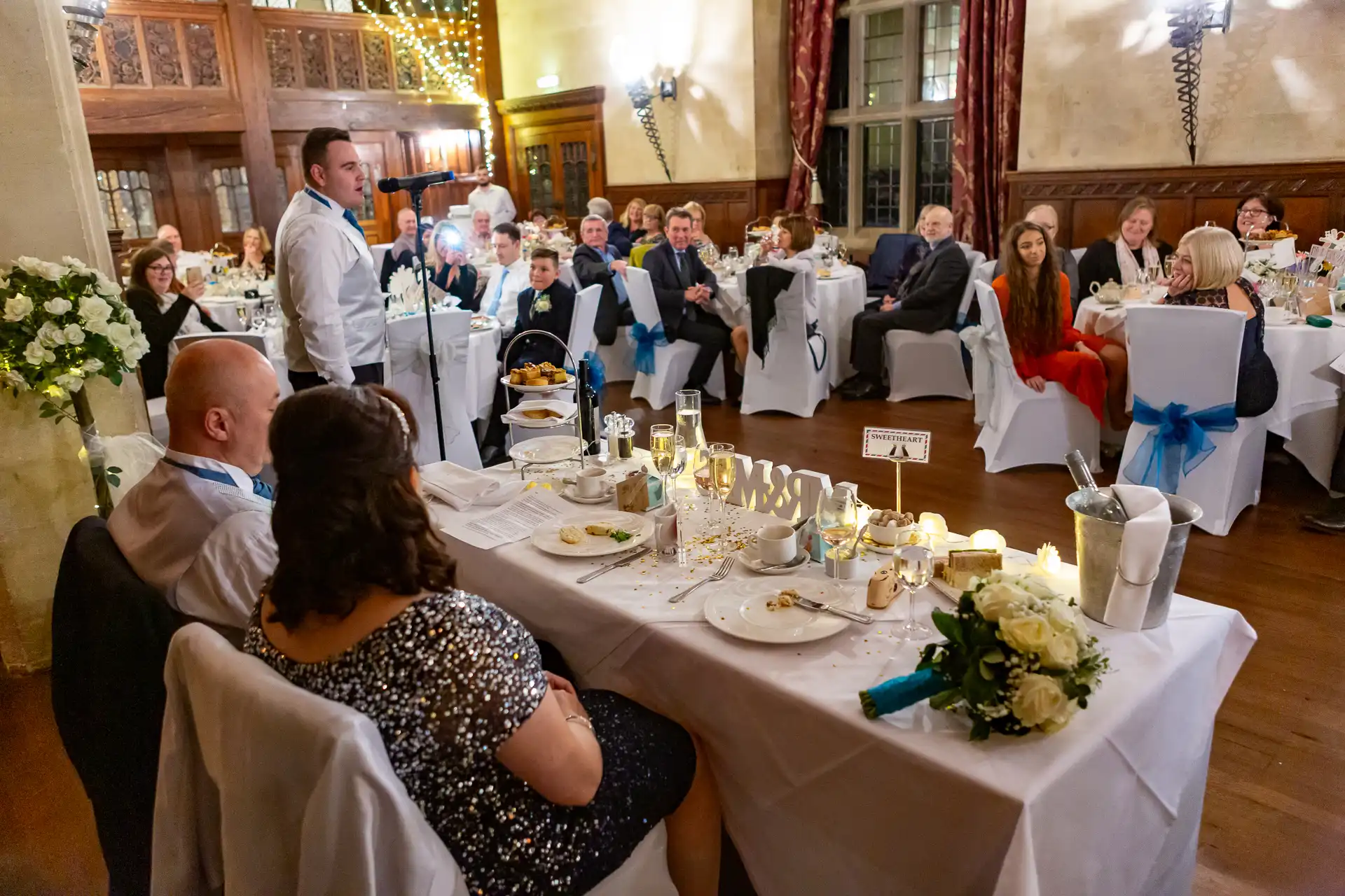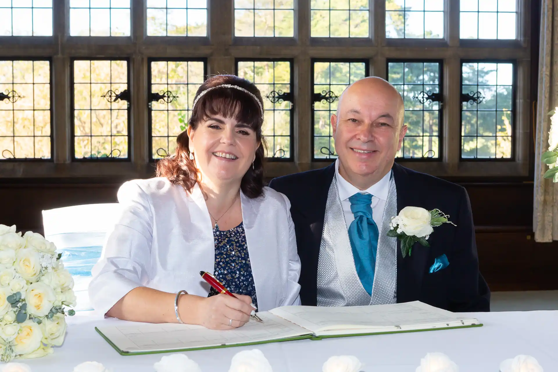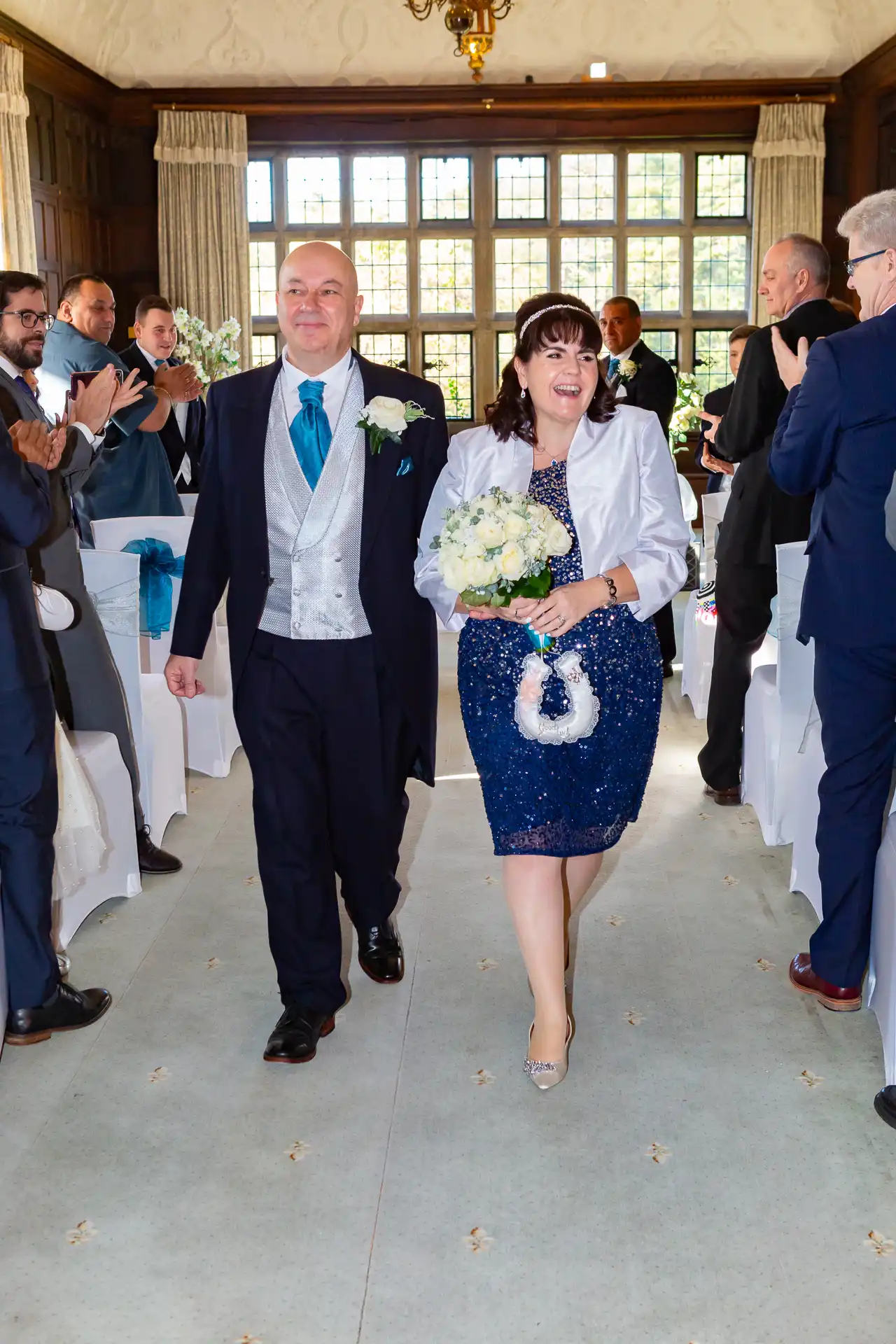 Nigel and Anna tied the knot at the magnificent Fanhams Hall in Ware, Hertfordshire—a venue renowned for its Jacobean architecture, landscaped gardens, and timeless charm. Their ceremony took place in the Long Gallery, a spacious and light-filled room that provided a stunning backdrop for their vows.