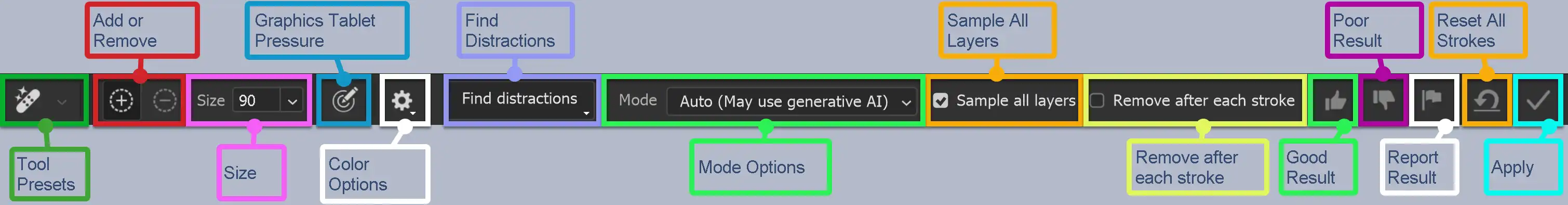 Auto. This may or may not use Generative AI in removing the distractions. Generative AI On. This will use Generative AI. Generative AI Off. This will not use Generative AI.
